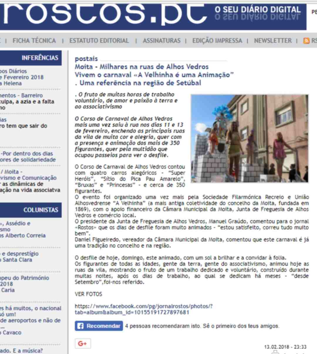 Veja as fotos aqui “Milhares na ruas de Alhos Vedros Vivem o carnaval «A Velhinha é uma Animação” . Uma referência na região de Setúbal . Uma referência...