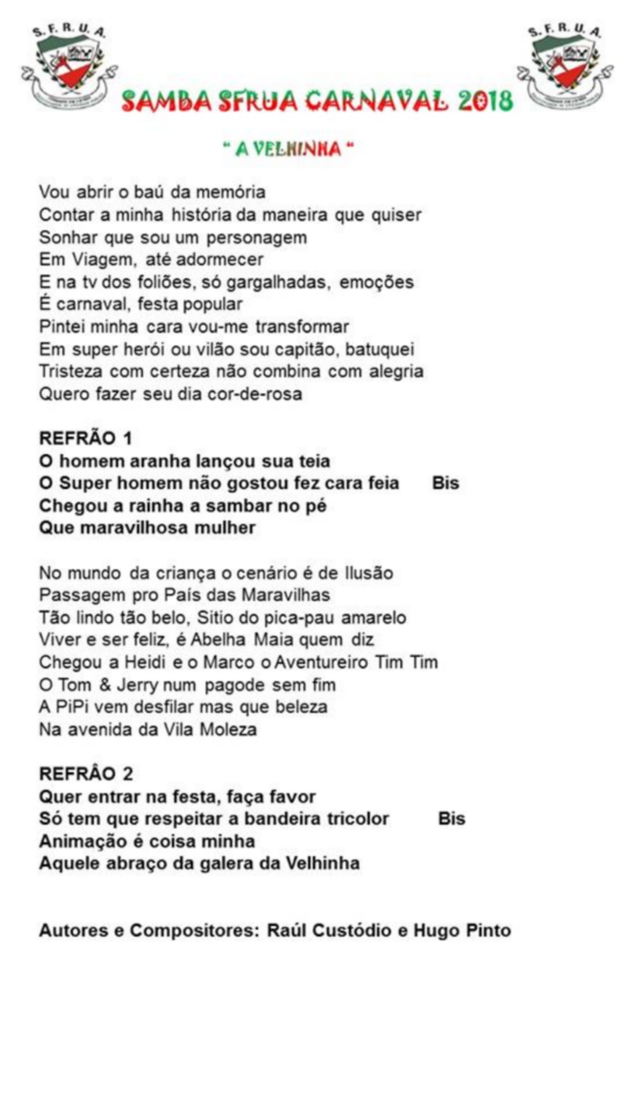 Um agradecimento especial à Bateria da SFRUA e Passistas que desde sexta-feira representam e muito bem a nossa bandeira, em saídas todos os dias e até altas horas da madrugada e sempre com um sorriso nos lábios e prontos para o desfile.